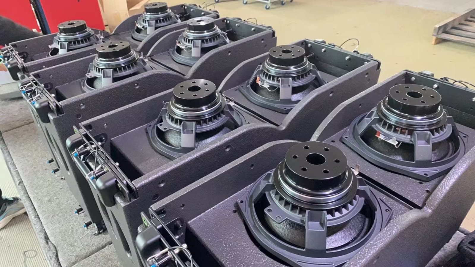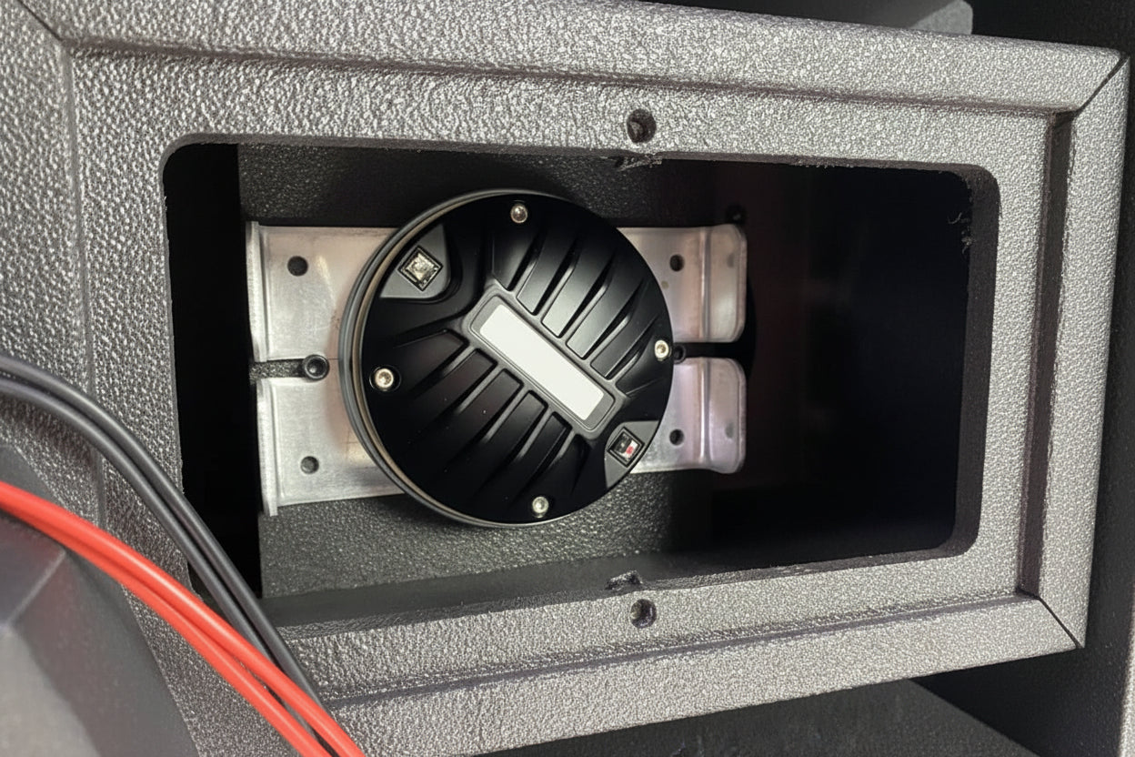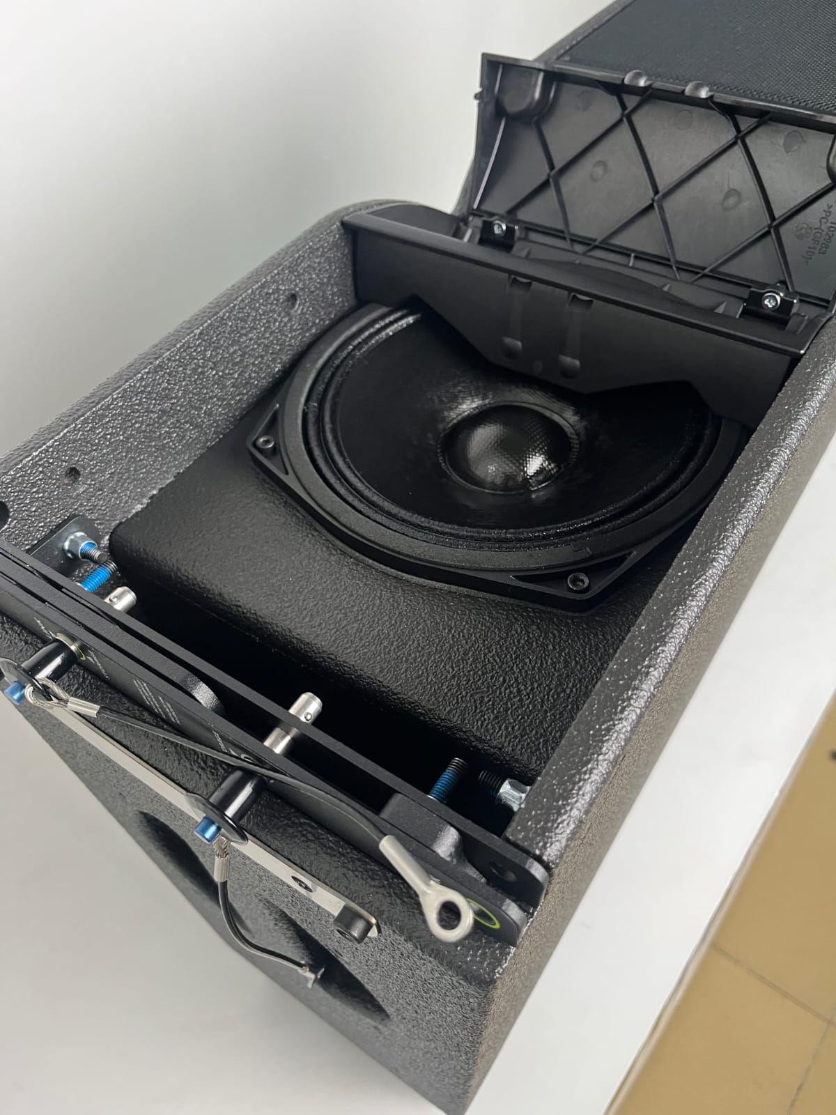 L’architettura interna riprende i layout professionali più collaudati: doppio woofer da 8” ad alta escursione e driver a compressione da 3” caricato su waveguide proprietaria, studiata per garantire accoppiamento perfetto tra i moduli e copertura uniforme su tutta l’area d’ascolto.